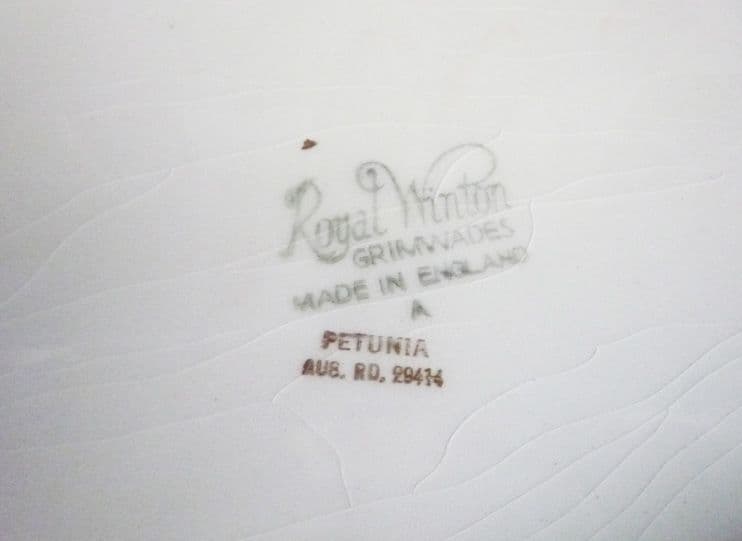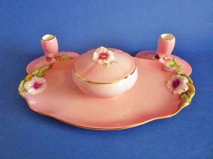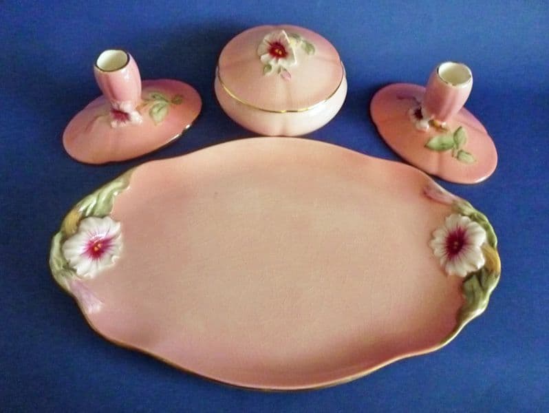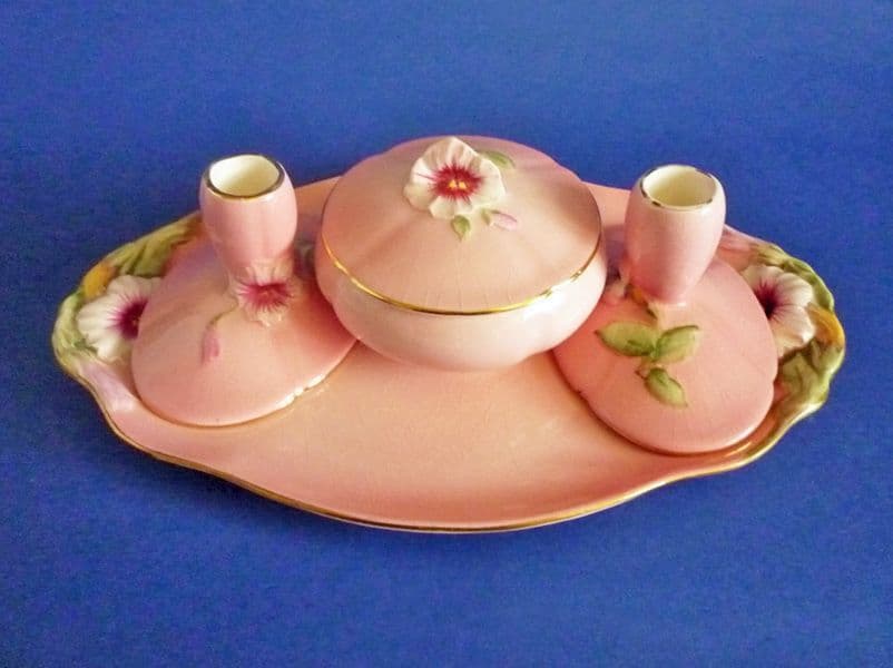 A good Royal Winton pink 'Petunia' dressing table set comprising tray, candlesticks and powder bowl. In great condition; no chips, cracks or restoration. The gilding is rubbed in places, especially on one candlestick and there is the usual glaze crazing which doesn't detract. Still a lovely set which displays beautifully - nice to find complete. These shades of pink are always difficult to photograph accurately and the best colour is in image 4. Royal Winton Grimwades A marks. Width of tray 31cm (12.2in)