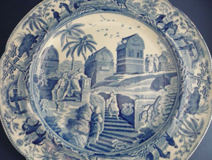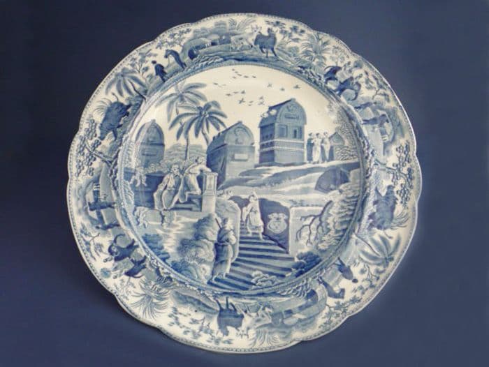 A lovely double indented shape plate, introduced by Spode specifically for the Caramanian series. Taken from Luigi Mayer's book 'Views in the Ottoman Empire, chiefly in Caramania' (pub.1803), this scene shows 'Sarcophagi and Sepulchres at the Head of the Harbour at Cacamo'. Each shape has a different view, but share an exotic border of palms, elephants and rhinoceros, together with other 'eastern' vignettes. In excellent condition; no chips, cracks or restoration. Shows little sign of wear; rare to find in such good order. Fine rippled glaze and mild age related crazing. Impressed lower case 'Spode' and '2'. Diameter 25.25cm (10in)