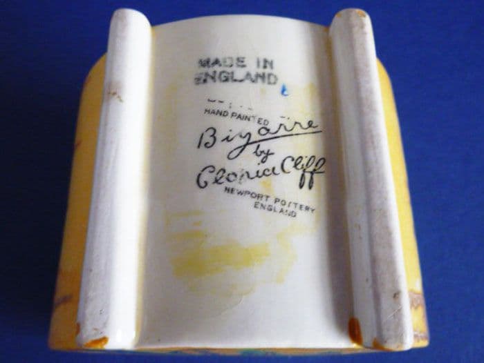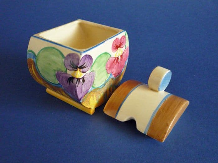 A stunning Pansies Bon Jour shape preserve pot and cover. Beautifully painted with strong colours on a delecia drip background. In excellent condition; no chips, cracks or restoration and showing little sign of wear. Bizarre by Clarice Cliff, Newport Pottery mark. Height 10.5cm (4.12in)
