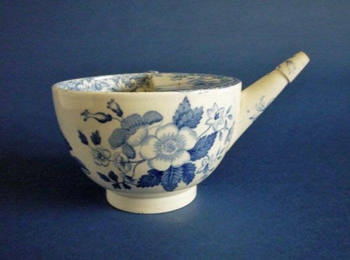 A lovely feeding cup in Spode's very pretty 'British Flowers' pattern introduced c1820. Beautifully patterned on the top, around the body, the inside rim, around the end of the spout and along the line of the handle. A fine example in exceptional condition; no chips, cracks or restoration. Very rare to find in such good order as they were so prone to damage. Printed 'Copeland and Garrett, late Spode' in underglaze blue. Overall length with spout 13.5cm (5.3in)
