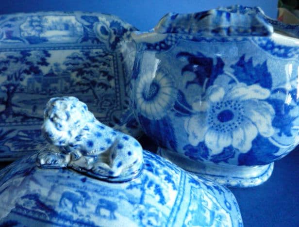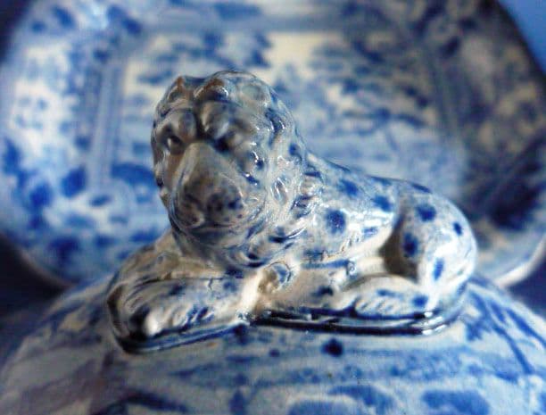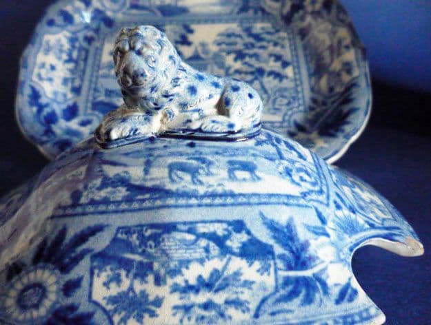 A series of untitled views based on engravings taken from W. Angus 'Seats of the Nobilty and Gentry in Great Britain and Wales' first published in 1797. The stand has one view, while the tureen has a different view on each side and a view to the base of the interior. The lid again has a single view. The borders consist of small vignettes with large bunches of flowers. The tureen has beautifully scrolled handles and the crowning glory is the painted lion finial on the lid. Examples are rarely marked (a plate is recorded with 'Ridgway' impressed).
