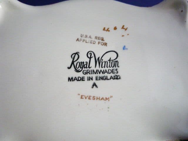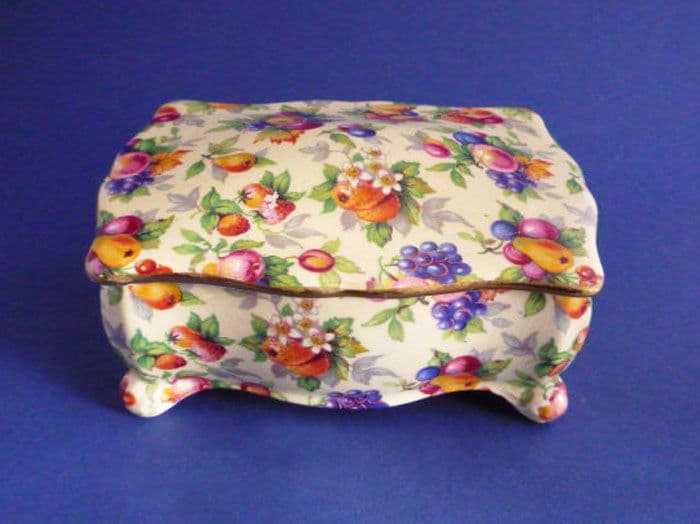 A lovely vintage Royal Winton 'Evesham' candy box in excellent condition. The gilding is good, with only some minor rubbing where the lid sits on the base. Rare to find in such good order. A fine example with the old 1950's Royal Winton, Grimwades mark and USA registration applied for. Length 14cm (5.5in)