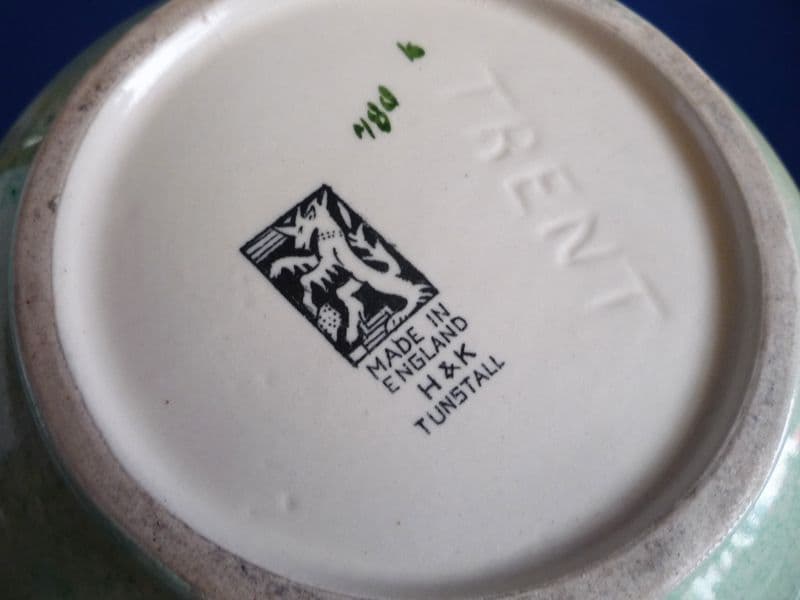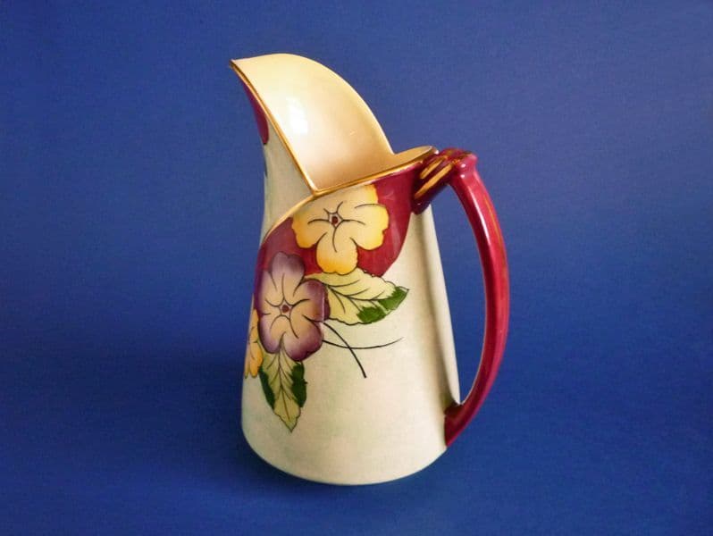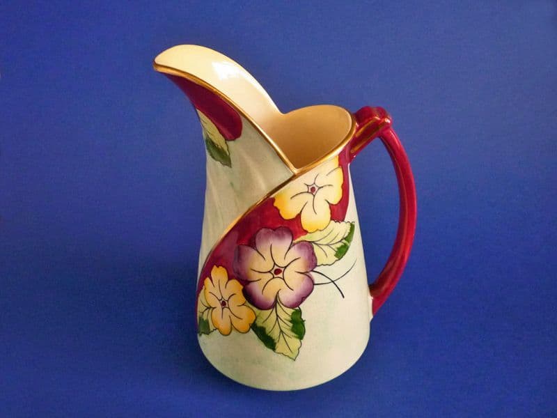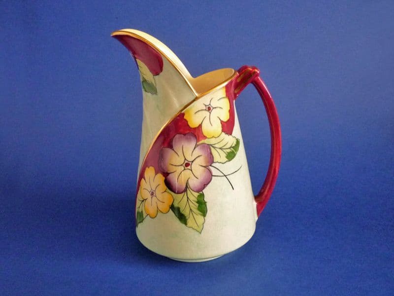 An elegant art deco 'Trent' shape jug in the Primula pattern designed by R. Grocott for Hollinshead and Kirkham. Boldly painted with yellow and mauve flowers on a sponged green ground. In excellent condition - no chips, cracks or restoration. Fine age related crazing, really only noticed on close inspection and nothing to detract from the display value of this lovely jug. A rare shape to find, especially in such good order. Printed H & K Tunstall mark and impressed Trent. Height 22.5cm (8.75in)