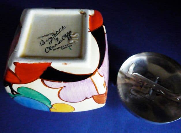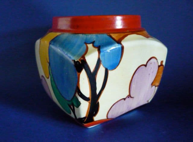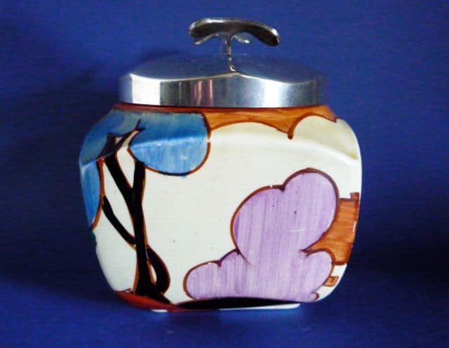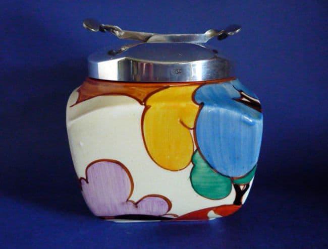 A fine Bizarre 516 shape box and silver plated lid with extending grips to remove sugar cubes. Beautifully painted in the blue Autumn design (sometimes called 'Balloon Trees') in burnt orange, green, red, yellow, purple and the signature blue. The pattern is repeated twice around the box, with a cottage nestling on two corners. In lovely condition; showing little signs of wear. A classic art deco shape and iconic Clarice Cliff pattern. Lithograph 'Bizarre by Clarice Cliff, Newport Pottery' mark. Height with lid 10.cm (3.9in)
