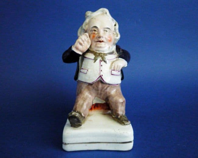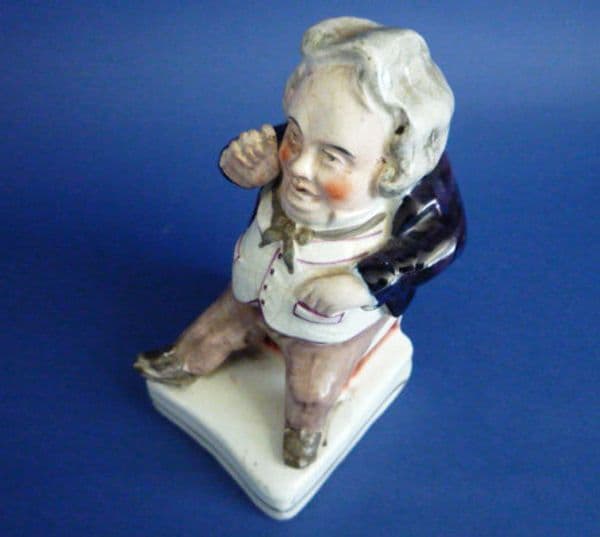 A rare square based 19th century Staffordshire figure of a portly snuff taker sitting on a footstool with leg outstretched. The features are very reminiscent of some caricatures of William IV. Fine colouring, including lots of cobalt blue to his jacket, indicative of this period of production. In great condition, showing age related crazing (nice to see) and a minor flake to the iron red on the back corner of the stool (see image 4). A real gem. Height 14cm (5.5in)