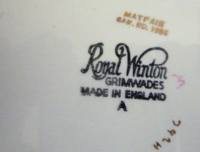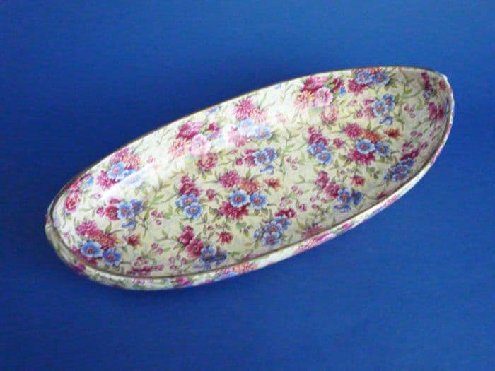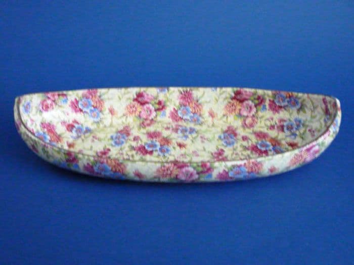 A lovely old Royal Winton canoe shaped dish in the pretty 'Mayfair' pattern. In excellent condition; no chips, cracks or restoration. The transfer is crisp and colourful. A fine example which displays beautifully. Rare to find in such good order. Vintage 'Royal Winton, Grimwades A' mark with pattern name and Canadian registration. Length 27.25cm (10.75in)