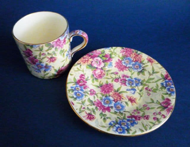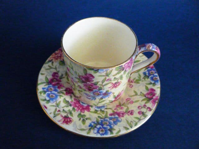 Vintage Royal Winton coffee cans and saucers are rare to find. Here is a lovely and seldom seen 'Mayfair' pair in excellent condition. Stunning cerise and blue flowers crisply depicted on a creamy yellow ground. Fine examples of a beautiful chintz. 'Royal Winton' mark with gold Canadian Reg. mark for 1951. Diameter of saucer 11.75cm (4.6in)