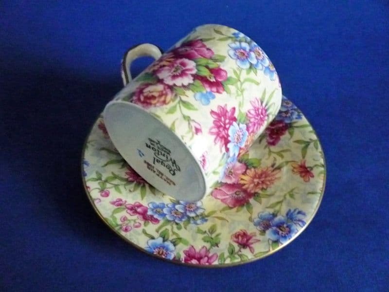Vintage Royal Winton coffee cans and saucers are rare to find. Here is a lovely and seldom seen 'Mayfair' pair in excellent condition. Stunning cerise and blue flowers crisply depicted on a creamy yellow ground. Fine examples of a beautiful chintz. 'Royal Winton' mark with gold Canadian Reg. mark for 1951. Diameter of saucer 11.75cm (4.6in)