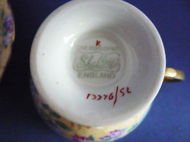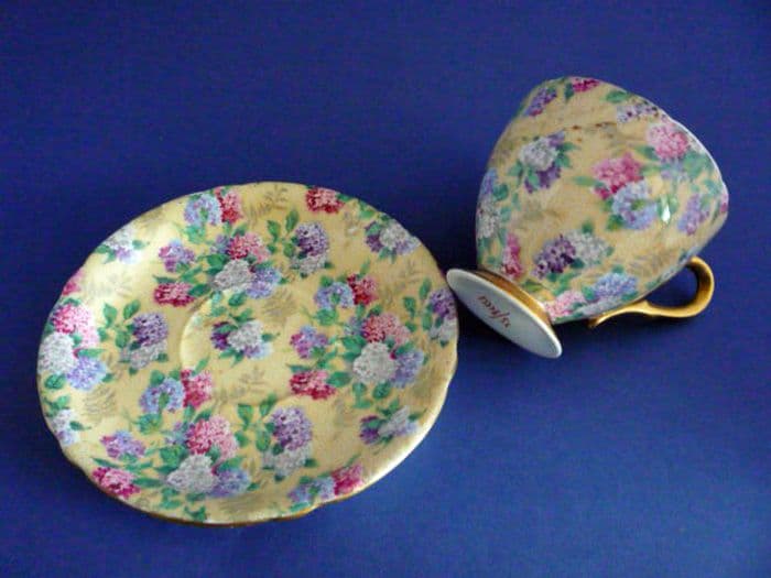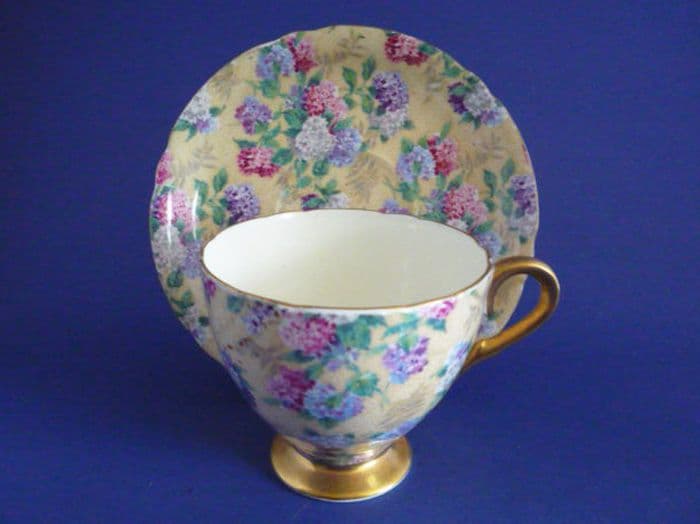 A classic Shelley fine bone china 'Summer Glory' tea cup and saucer with best burnished gold trim. In excellent condition; both pieces 'ring' beautifully. Nice to find in such good order. Shelley Fine Bone China mark in green. Diameter of saucer 14cm (5.5in)