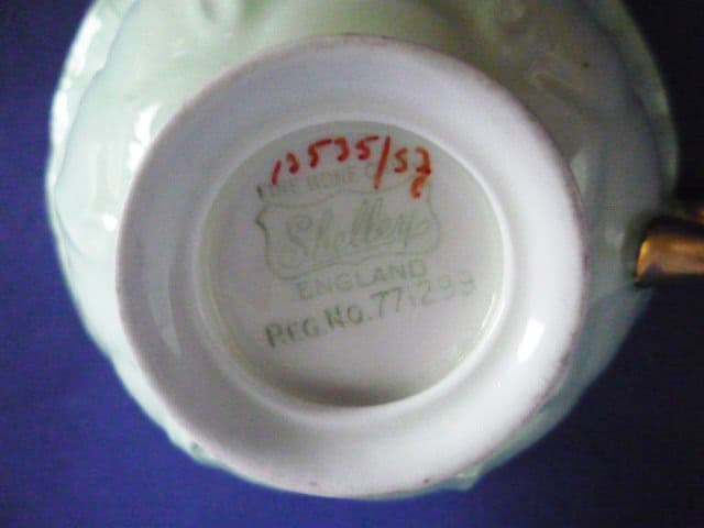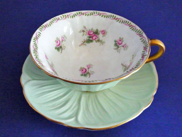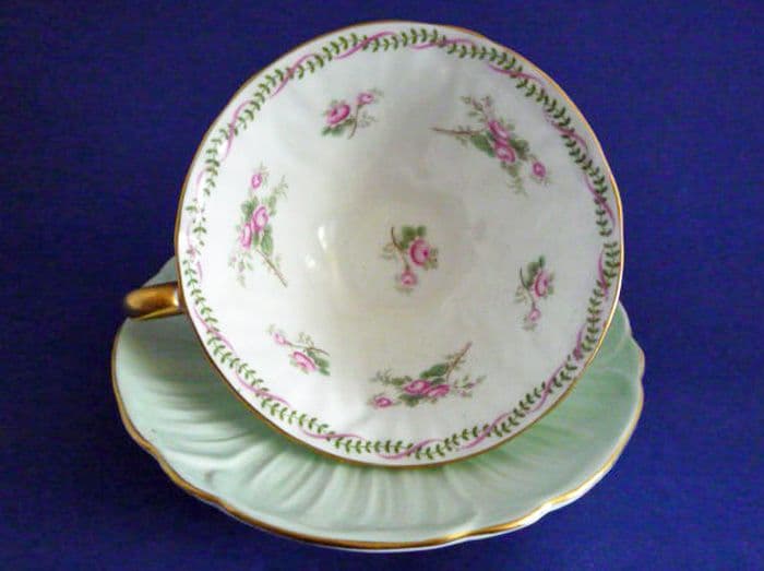 A pretty Shelley 'Rose Sprays' Oleander shape duo. The petal shaped cup and saucer delicately washed in pale green 'eau de nil'. Trim and handle finished in best gold. In excellent condition; no chips, cracks or restoration. Both pieces 'ring' beautifully and the gilding is unworn. Rare to find in such good order. Shelley Fine Bone China marks, registration number 771299 (for Oleander shape) and painted pattern number 13535 to cup. Diameter of saucer 14cm (5.5in)