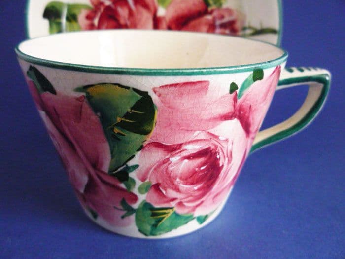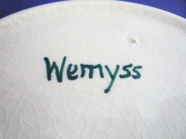 A lovely Wemyss tea cup and saucer beautifully painted with cabbage roses. Bright, clear colours and both pieces in great condition. No chips, cracks or restoration. Clean age related crazing associated with these wares, but nothing to detract. Rare to find in such good order. Painted Wemyss marks in yellow (cup) and green (saucer). Diameter of saucer 12.75cm (5.1in)