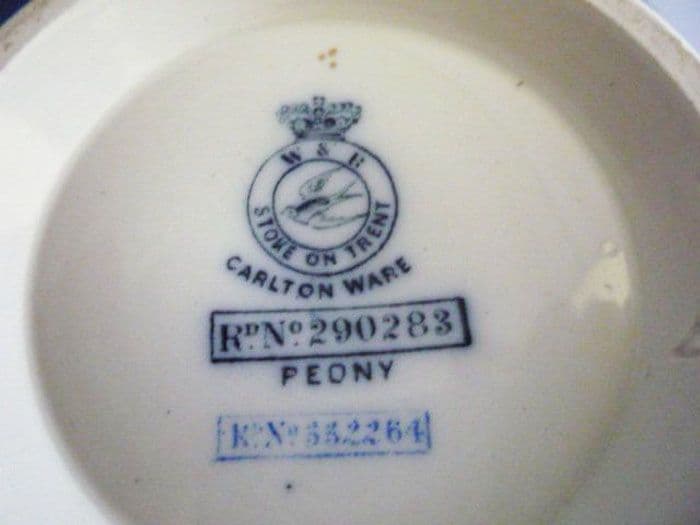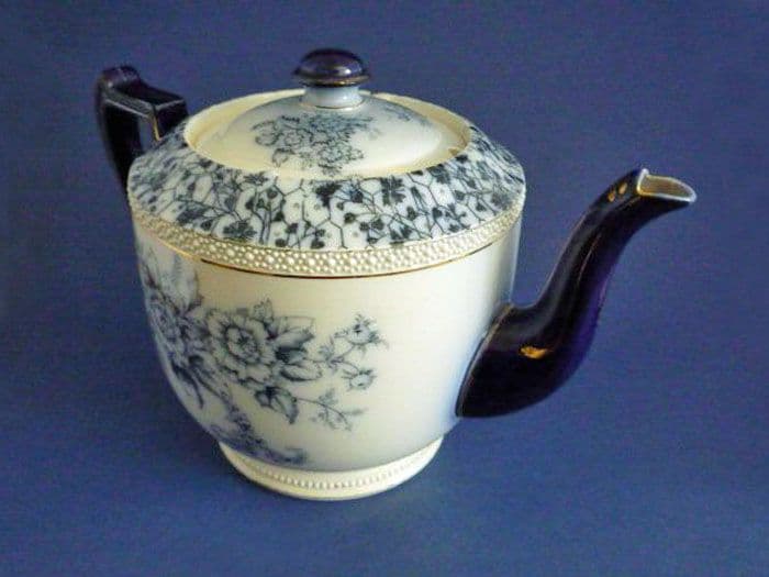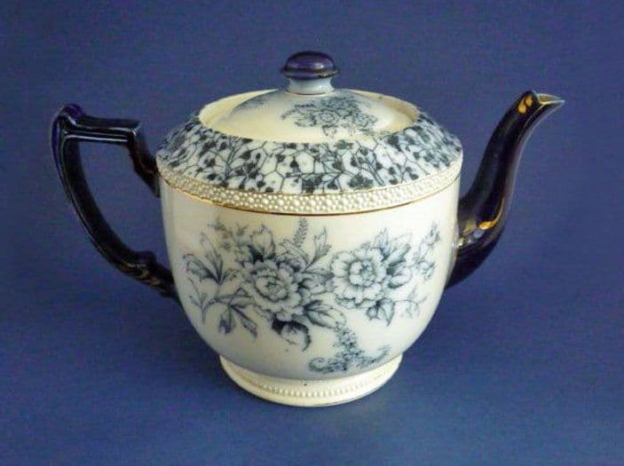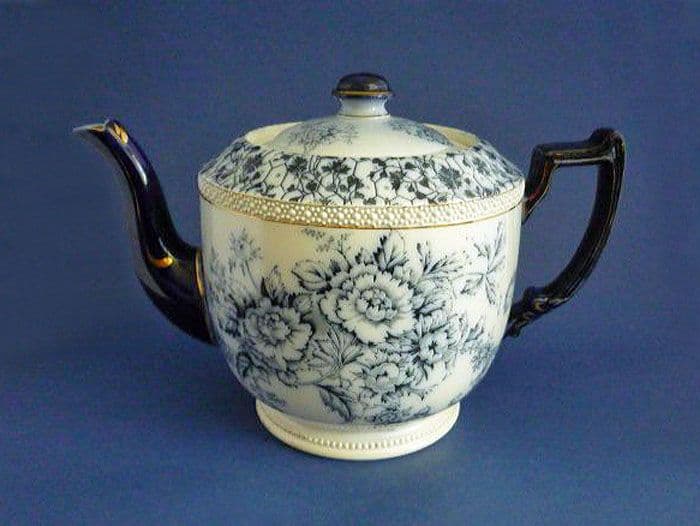 A superb Victorian teapot beautifully printed with sprays of flow blue peonies and trimmed in best gold. A lovely piece in excellent condition; no damage and little signs of wear. Rare to find antique teapots in such good order. Unusual 'lockable' lid. Printed W & R Crown and Bluebird mark with Carlton Ware and registration numbers. Length handle to spout 23cm (9in)